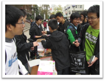 咱們光棍有力量,在過節的同時,每個同學憑廢舊電池,可以來活動現場換取“優質光棍”環保袋一個。這樣一個特殊的日子裏,環保從我做起體現了科大人的社會責任,也引起了社會上媒體的關注,安徽商報的記者在活動現場進行了采訪,並在頭版進行了報道。整個活動對廢舊電池的成果也頗為豐厚。