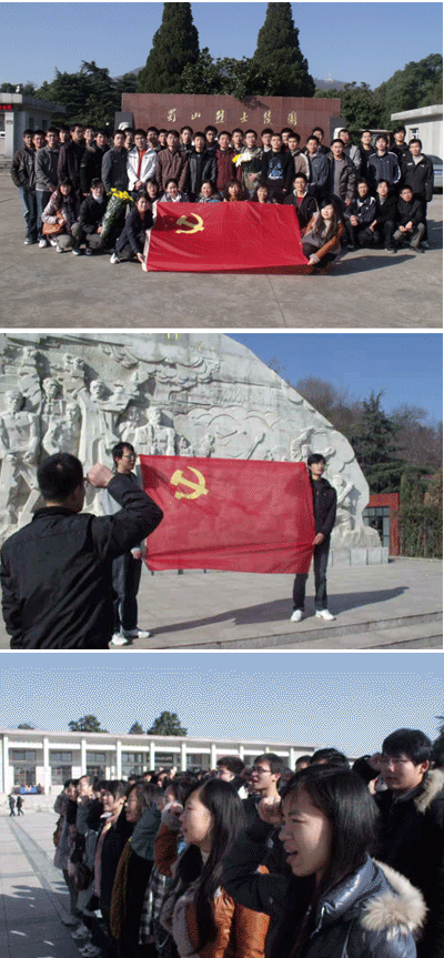 上午10點,同學們陸續到達大蜀山腳下,集合後大家一起參觀了蜀山烈士陵園,向革命先烈獻花。黨員同學們在“人民英雄永垂不朽”雕像前進行了莊嚴宣誓,表達了愛黨愛國的決心。大家參觀了紀念館,瞻仰英烈們的先進事跡後同學們感觸頗深,團員同學更表示得到了一次深刻的思想洗禮。