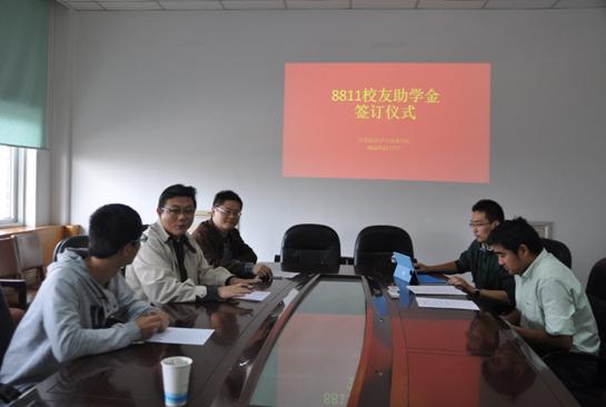 2013年11月7日,“8811助學金”簽訂暨首期頒發儀式在計算機學院會議室舉行。8811校友會代表姚遠、計算機學院黨總支書記錢海、2013級本科生班主任王海龍和獲助同學參加了儀式。儀式由計算機學院團總支書記周宇主持。