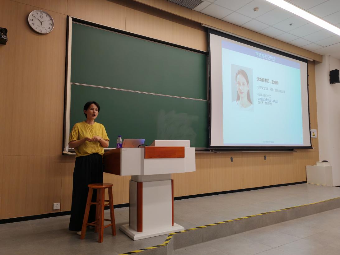 黨委副書記宮曉梅老師首先致辭,她歡迎全體新同學的到來,希望大家積極調整適應新環境,保持身心健康,主動溝通交流,規劃發展目標,不斷成就更好的自己。