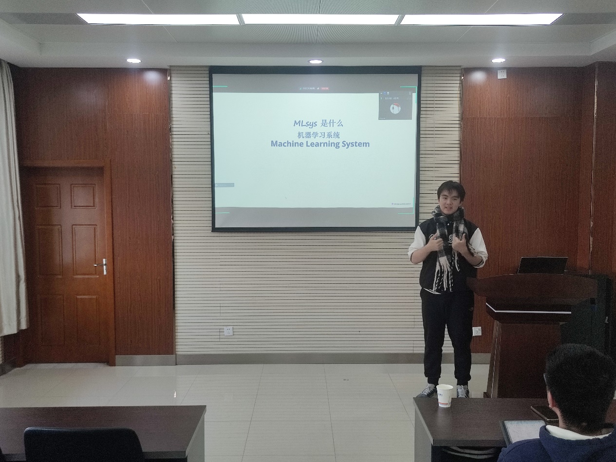 接著,龍浩泉同學向大家介紹了機器學習係統方向。龍浩泉同學從學校的培養方案出發,分別介紹了體係結構和現代人工智能兩個領域的現狀,引入了用體係結構知識提升大模型訓練效率的必要性。隨後,龍浩泉同學分別用同學們生活中的例子介紹了分布式機器學習和AI加速硬件等機器學習係統的方向,並結合自己的研究項目向同學們介紹了機器學習係統領域的前沿進展。最後,在提問環節,龍浩泉同學和同學們探討了機器學習係統在產業界的近況,並推薦了幾位校內相關方向的老師,同學們收獲頗豐。