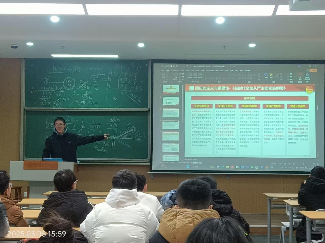 而後,王子涵同學帶領團員們對團紀主題進行了集中學習。向各位團員講解了團紀的定義與重要性以及新時代對團紀的新要求,增強了團員們的政治覺悟,明確了從嚴治團的重要任務,提升了團員們的責任意識,再次明確團員義務。